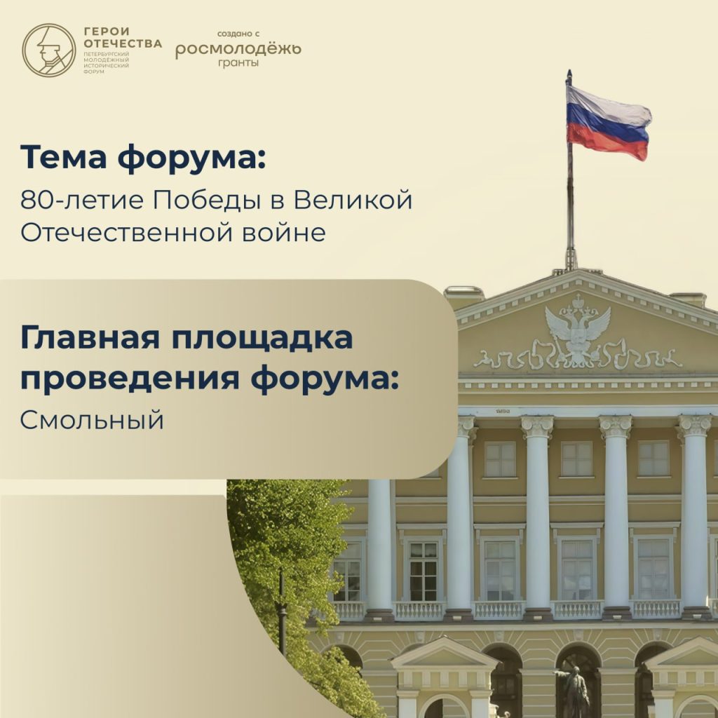 В период с 1 по 3 октября 2025 года в городе Санкт-Петербурге пройдет IV Петербургский молодежный исторический форум «Герои Отечества» по инициативе команды школьников и студентов при поддержке Министерства просвещения Российской Федерации, Федерального агентства по делам молодёжи, Российского исторического общества, «Движение Первых», депутатов Государственной Думы и сенаторов Российской Федерации.